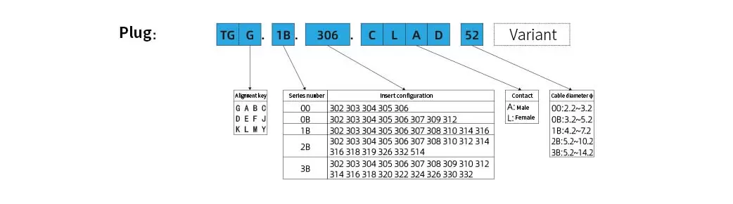 Schlüssel (G) oder Schlüssel (A…M und R) – Schnell-Push-Pull-Selbstverriegelungssystem; – Wasserdichte Verbindung (IP50); – Multipoltypen 2~32 Kontakte; – Mehrere Schlüsseloptionen, um ein Kreuzstecken ähnlicher Steckverbinder zu vermeiden;